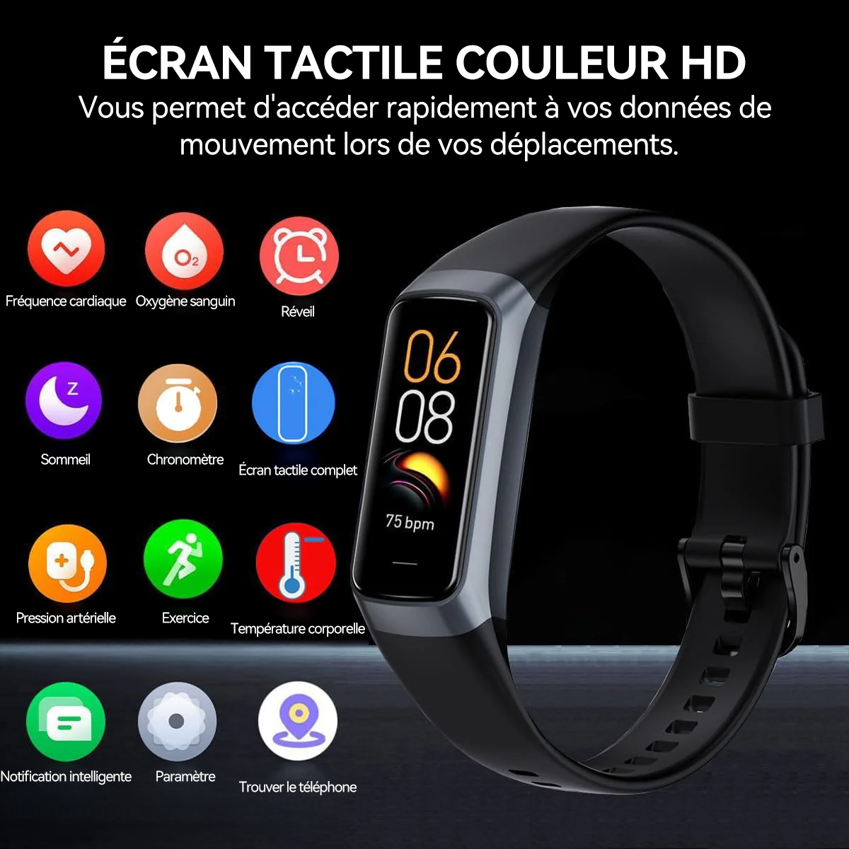 Le bracelet surveille avec précision votre fréquence cardiaque et votre niveau d’activité, vous aidant à rester dans votre zone d’entraînement optimale et sûre. Il suit instantanément les variations d’intensité et les réactions de votre corps, rendant chaque séance plus scientifique et axée sur votre bien-être.